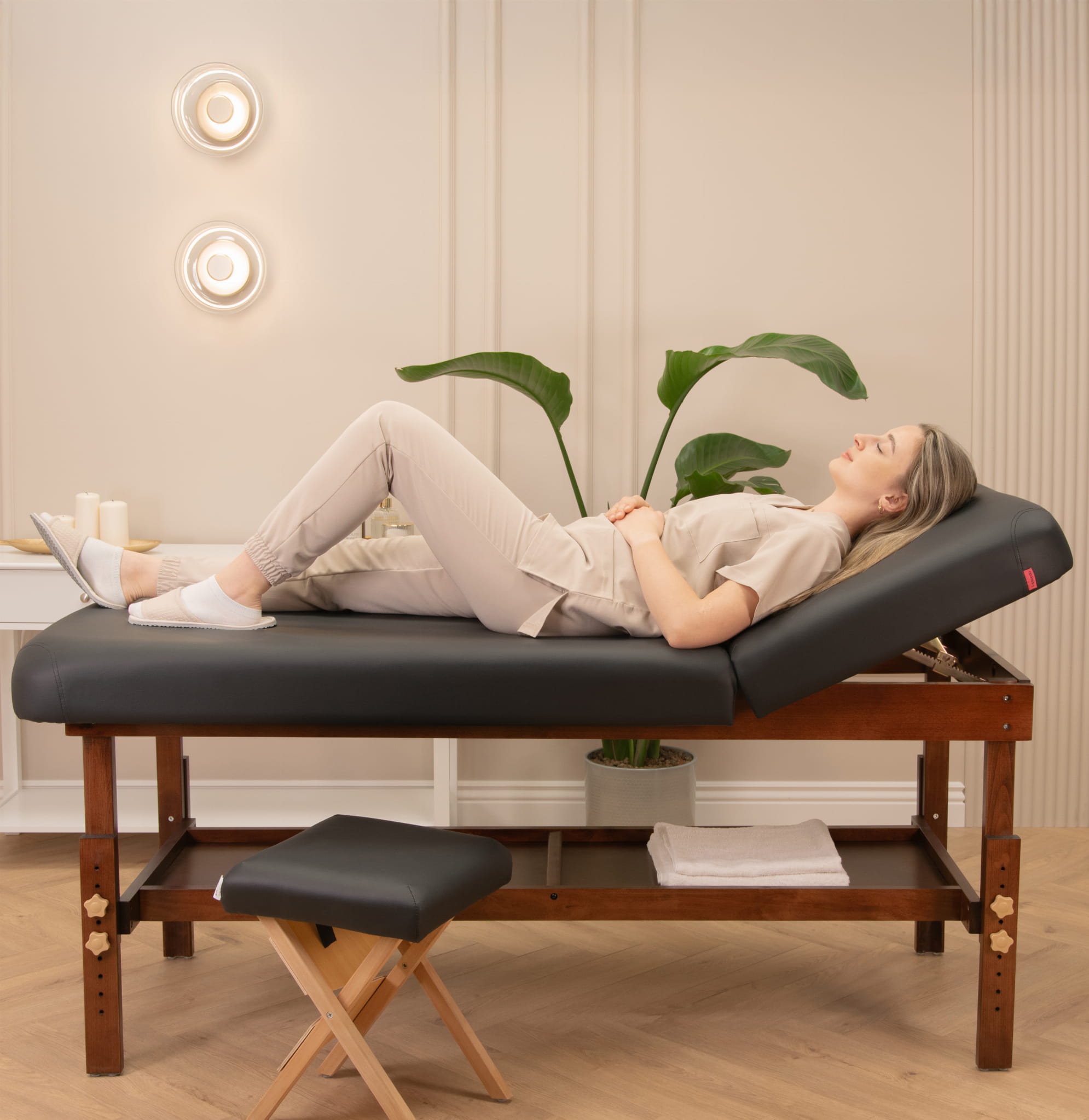 Stelaż wykonany z lakierowanego drewna bukowego, które charakteryzuje się niezwykłą trwałością i naturalnym wyglądem. Dodatkowym atutem jest praktyczna półka pod blatem, idealna do przechowywania ręczników, olejków i innych akcesoriów do masażu.